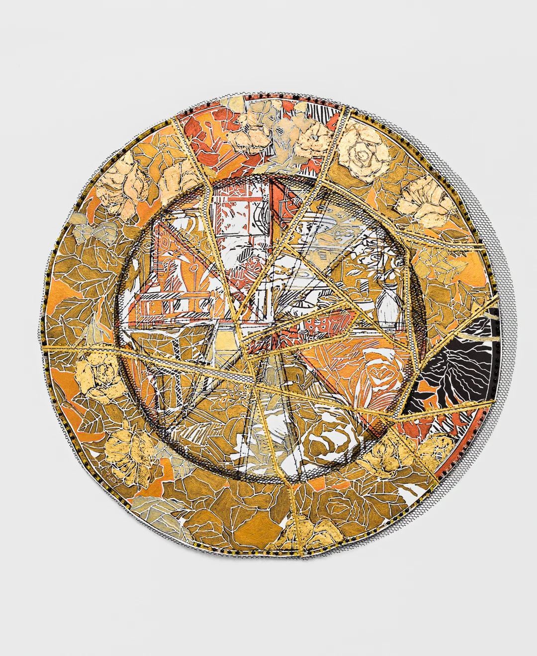 4 panel lino block print on Wenzhou paper hand sewn onto tulle work (panels 135 x 300cm hung on 2 tracks c.30 cm apart, installation c.300 x 420 cm – timber slat headers, acrylic rod footers)